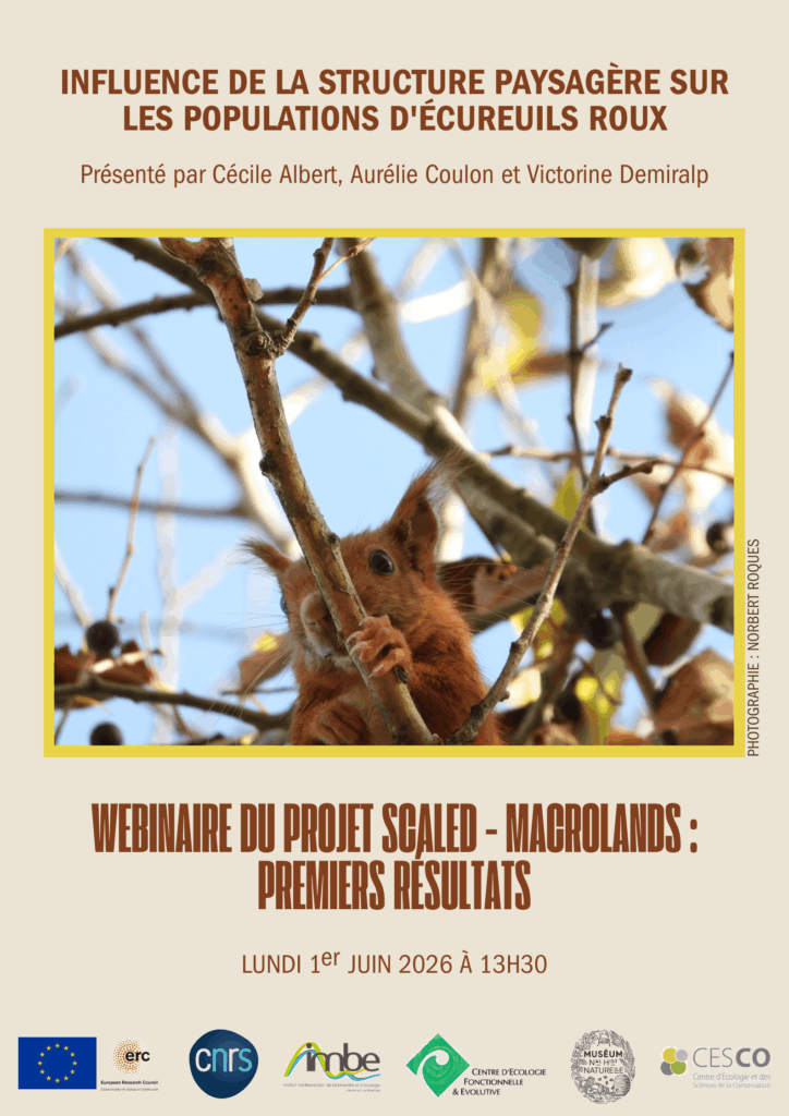 ‘Vous avez participé au suivi de populations d’écureuils roux et nous vous en remercions chaleureusement. Nous vous invitons à une conférence en ligne le lundi 1er juin 2026 à 13h30 afin de vous présenter les premiers résultats sur les 7 zones d’étude. Au programme, une présentation d’environ une heure divisée en trois parties, puis nous répondrons à vos questions. Je commencerai par le contexte de l’étude et le travail d’échantillonnage effectué, ensuite Aurélie Coulon exposera les premiers résultats génétiques (à l’échelle des 7 zones d’étude) et finalement Cécile Albert présentera les suivis GPS réalisés dans la zone d’Aix-en-Provence. Un lien de visioconférence zoom vous sera transmis quelques jours avant le webinaire’.