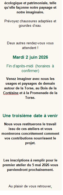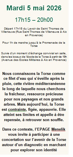 Nous voulions vous faire connaître nos préoccupations et espérons qu’elles seront prises en compte lors des ateliers des 5 mai et du 2 juin et ce dans la perspective de conserver et défendre définitivement le site naturel exceptionnel du Parc Naturel Urbain d’Aix qui se situe pour partie dans le bassin versant de la Torse.