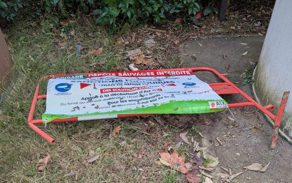 Un vandale a non seulement renversé le panneau affichant les sanctions encourues par les auteurs des dépôts sauvages mais a aussi cassé un des montants de ce panneau pour qu’il ne puisse pas être redressé !