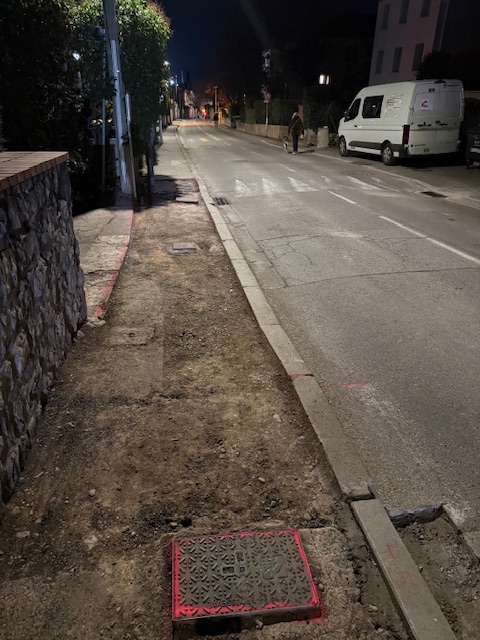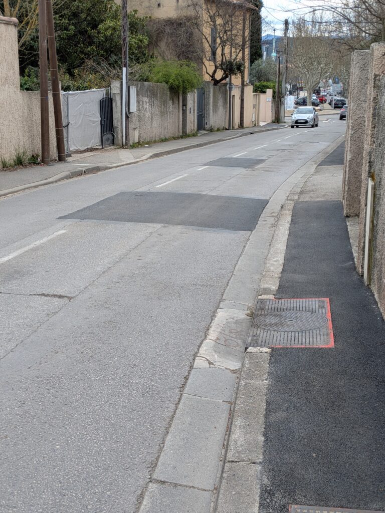 Et soudain, durant les nuits des 11 au 13 mars 2026, de nombreux engins de travaux publics investirent la rue. Le déploiement en machines diverses (voir photos) était tellement impressionnant que l’on espérait que des travaux conséquents allaient débuter avec peut-être, une mise aux normes des trottoirs. Mais non, rien de tout cela n’eut lieu. Seules quelques plaques de revêtement goudronneux ont été appliquées par endroit sur les trottoirs et la rue (voir photos). On peut une nouvelle fois regretter la mauvaise communication des autorités sur ce sujet. Pour beaucoup, la montagne avait finalement accouché d’une souris.